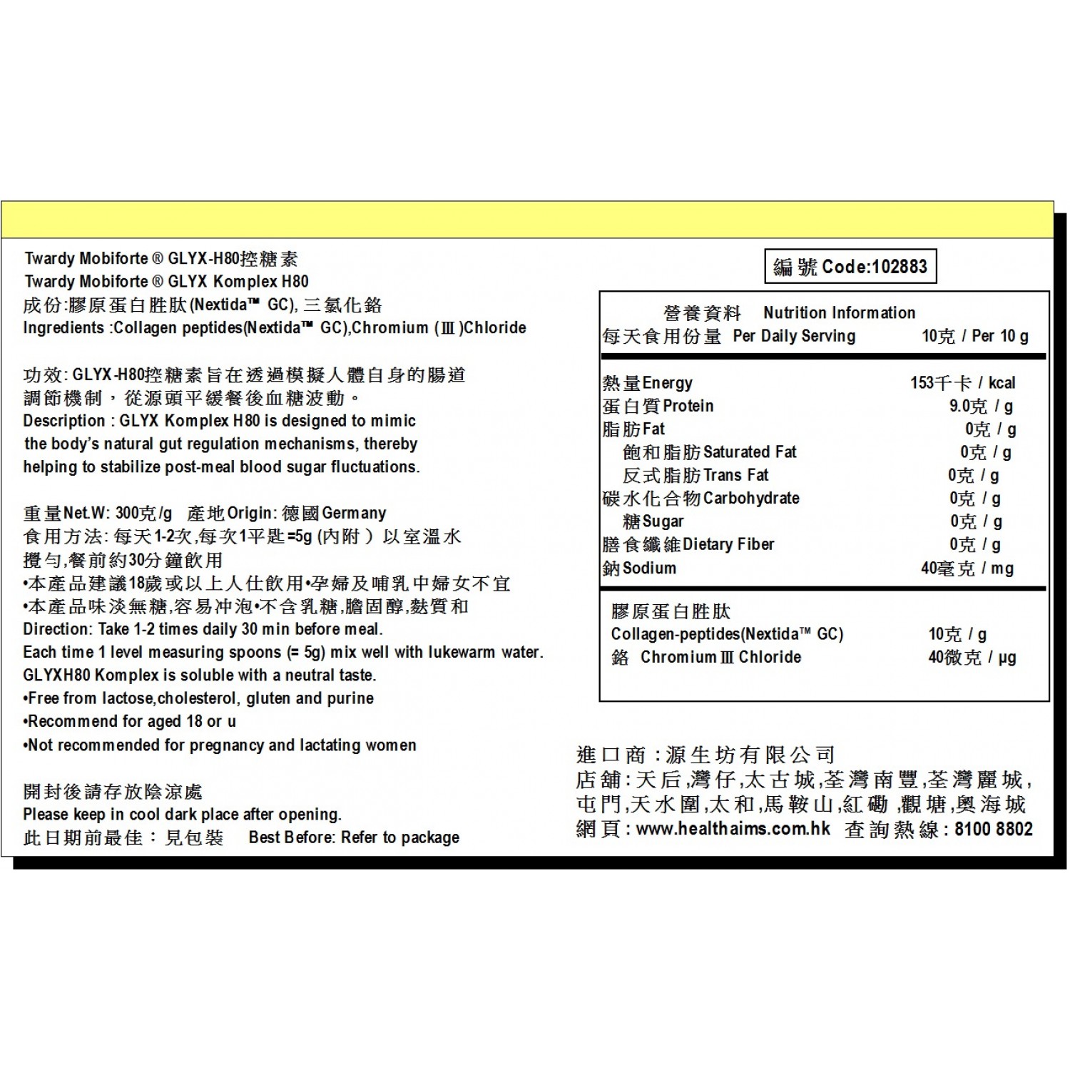 本產品所含的生物活性勝肽具有極佳的生物利用度,能夠被身體高效吸收。僅在餐前服用一次,就有助於避免所謂的「血糖過山車」現象,從而獲得更多能量、更少飢餓感以及更好的專注力。